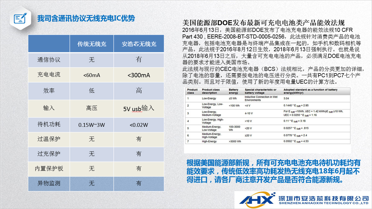 我司無線充電IC方案具有體高、成本優(yōu)勢明顯、應(yīng)用電路簡單等特點,發(fā)射和接收IC集成度高,帶有通訊協(xié)議,具有異物識別、過充保護(hù)、過放保護(hù)、短路保護(hù)等功能。